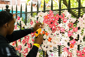In our own words: "Our art celebrates our neighborhood's team spirit. Our culture pulls up for each other. Our art displays the many stories there are among the members of our community. At Concourse House, our mothers face stigmas surrounding homelessness; our population often feels unheard; isolated and ignored. Building community connections and creative partnerships outside of the shelter with a public arts program pilot has been transformative in fostering a sense of belonging and self-expression for our mothers. An example is the multigenerational connections between neighbors like our crochet mural collaboration with the seniors who live on the Serviam campus. Our art follows the journey of our mothers' transition from Concourse House shelter and shifts the narrative from individuals trying to get out to making a life of their own, artists-apprentices, teachers, mentors and leaders in the process of building-up a neighborhood public art program." (2023)